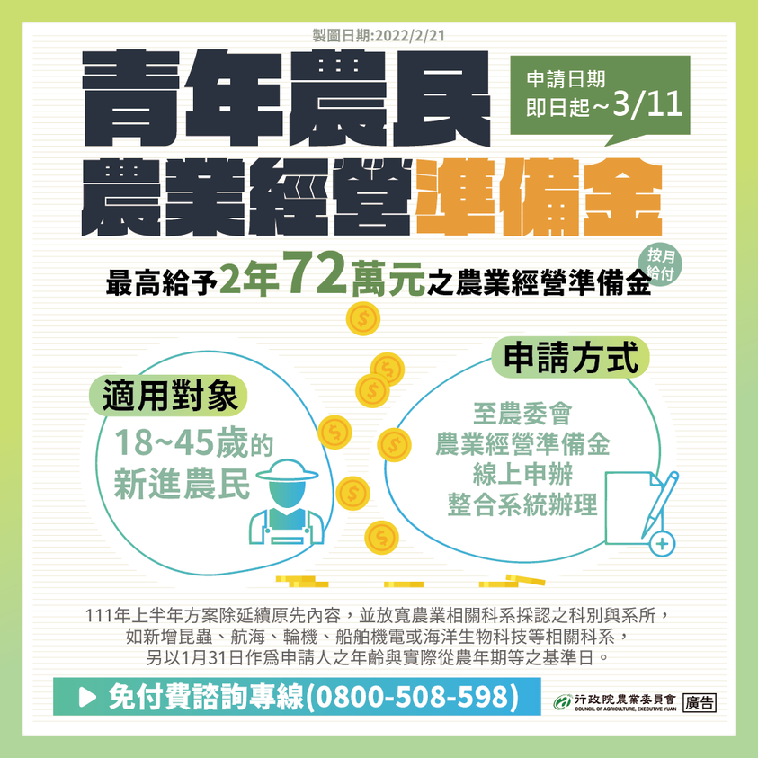 為了穩定新進農民從農生活、並降低從農風險以營造良好農業環境,鼓勵優秀人才投入農業,農委會推動「青年農民農業經營準備金」方案,18~45歲新進農民皆可申請,符合資格者最高可領2年72萬元的農業經營準備金(按月給付)歡迎大家把握時間報名!